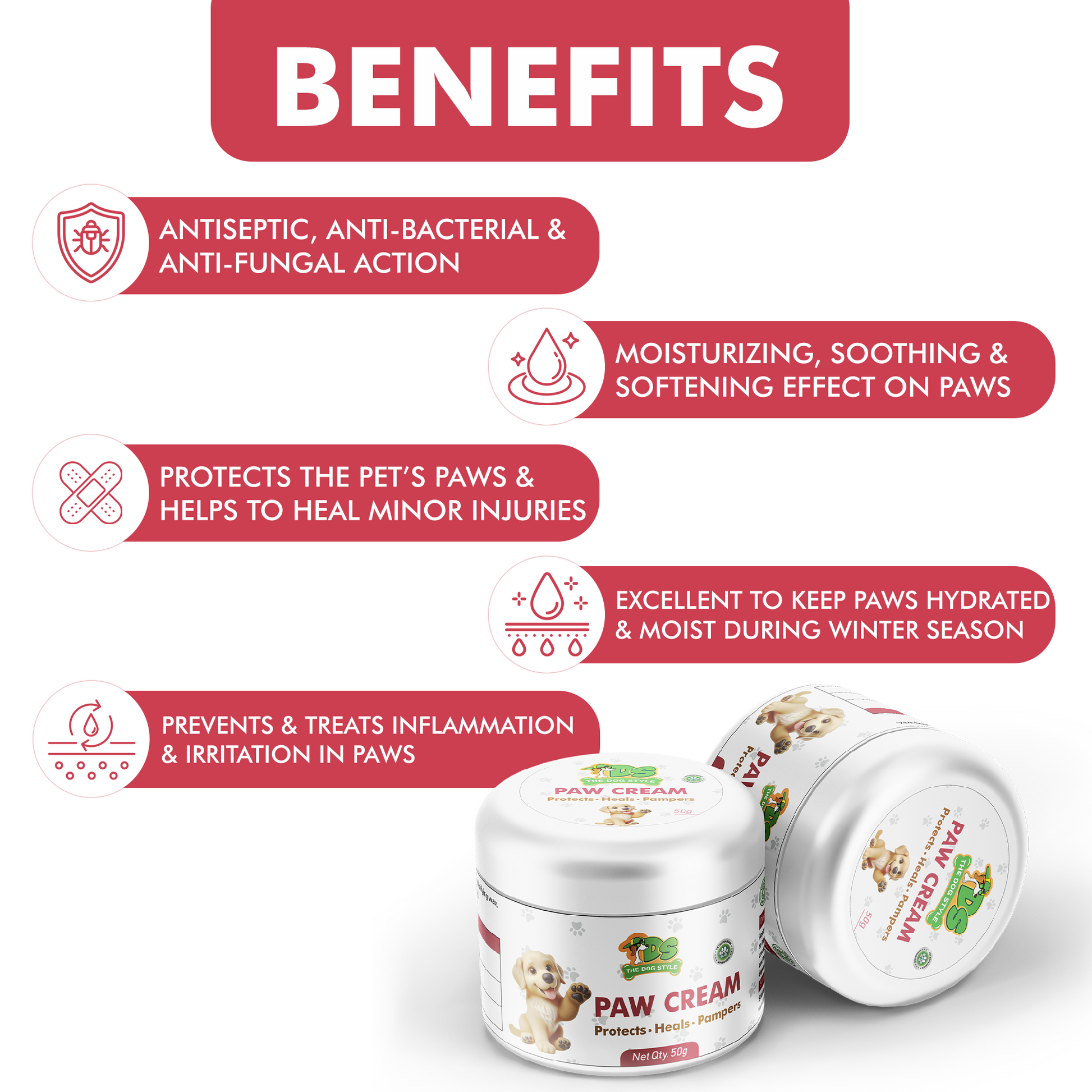 TDS Paw Cream for Dogs – An Essential for Your Pet’s Paw Health. Enriched with natural ingredients like Almond Oil, Beeswax, Shea Butter, Sesame Oil, Aloe Vera, Neem, and Turmeric to moisturize, soothe, and protect.